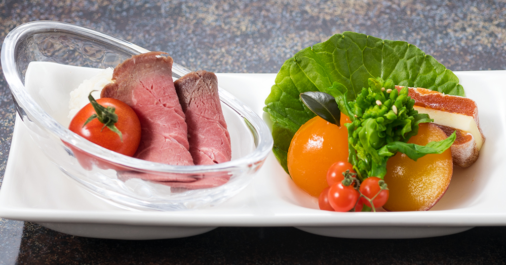 - (上国産牛(200g)付出し・うどん・フルーツ)